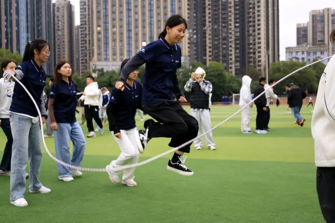 比赛当天,天气较寒冷,但抵挡不住同学们心中的熊熊烈火。来自19个新生班级的342名选手轮番跃动,长绳翻飞,呐喊助威声此起彼伏。最终,道创2501班以四分钟370个的优异成绩摘得桂冠。