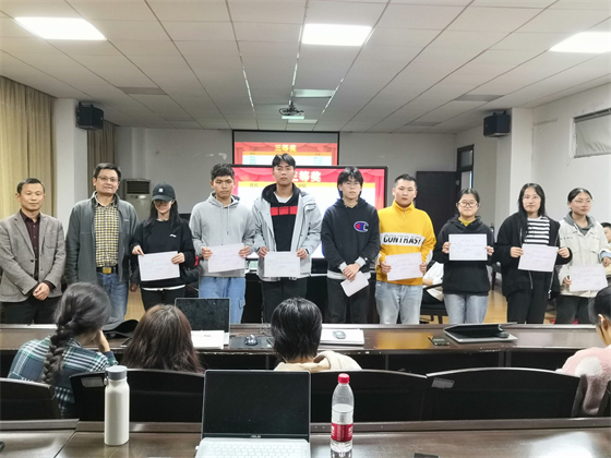首先,徐鹏宣读获奖学生名单,并对他们在比赛中的表现给予充分肯定,并鼓励他们在接下来的比赛中再接再厉,展现测绘人的奋斗精神。随后,到场老师为获奖学生颁奖并与其合影,同时详细介绍即将开展的湖南省第三届大学生测绘综合技能大赛相关注意事项,鼓励同学们踊跃参赛。