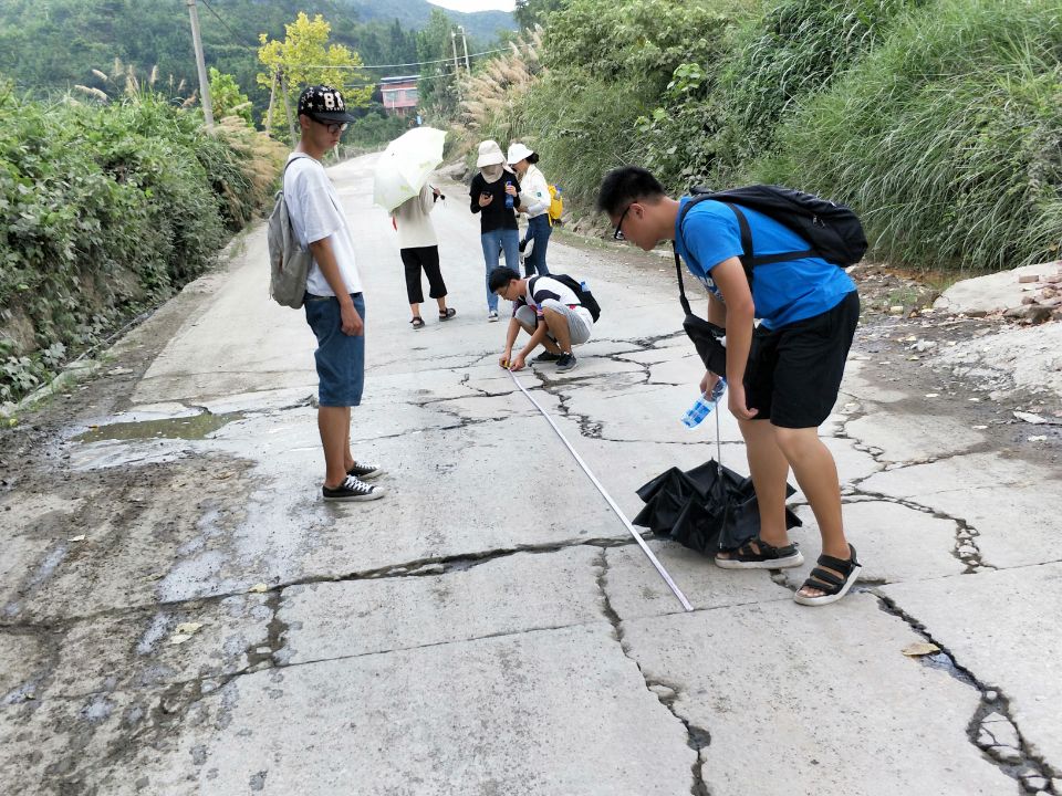早上,实践小队在下源村村委会召开“三下乡”活动启动仪式。会上,队长郭家胜对整个实践活动进行系统的规划和安排,并阐明今日的工作内容与工作目标。队员们热情高涨、积极配合、发言活跃。会议结束后,调研活动正式开始。调研小队沿县道进行粗略地观察,发现了很多道路问题,如:路边护栏破坏、交通标志缺损、路面裂缝断裂等。调研小队在经过长途观察,最终选择了一处破坏较为严重的路段(x037桩号K5+100至K6+100),进行路基路面、沿线设施等情况的勘测统计,发现破碎板、裂缝、板角断裂、边角剥落、露骨等问题。