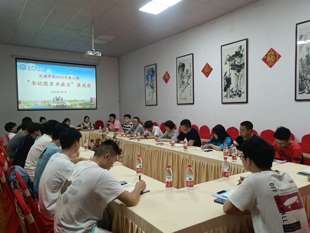 2022年6月7日,交通学院于金盆岭校区校友中心会议室开展2022年第三期“书记院长开放日”座谈会,学院党委书记刘朝辉、院长张军辉、党委副书记涂道勇、关工委吴滨、2021级辅导员史亚杰及21位学生代表参加。