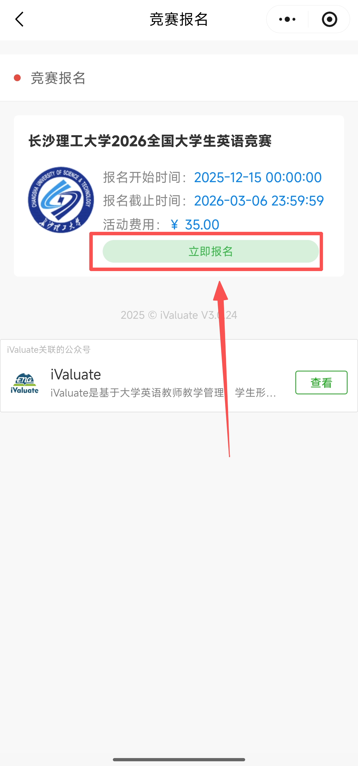 1、 扫码关注iValuate”微信公众号,点击公众号的“英语竞赛”菜单打开“iValuate”小程序,或者通过其他方式打开“iValuate”小程序。