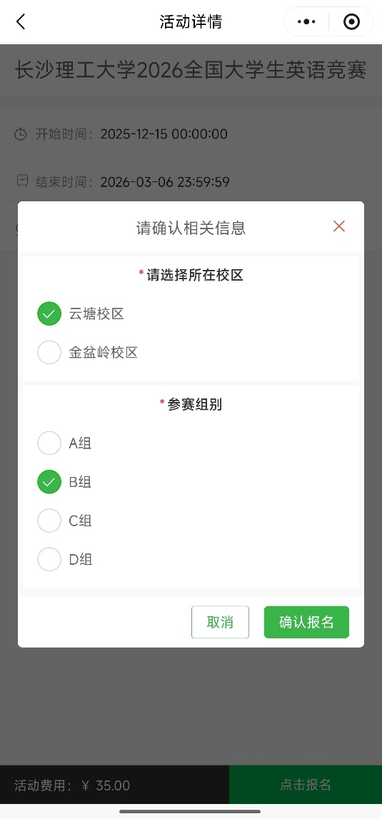 4、 选择所在校区和组别之后,点击“确认报名”。请认真选择所在校区和组别,确认之后无法修改。支付成功之后,报名完成。可在“我的”页面,点击“活动订单”查看报名记录。