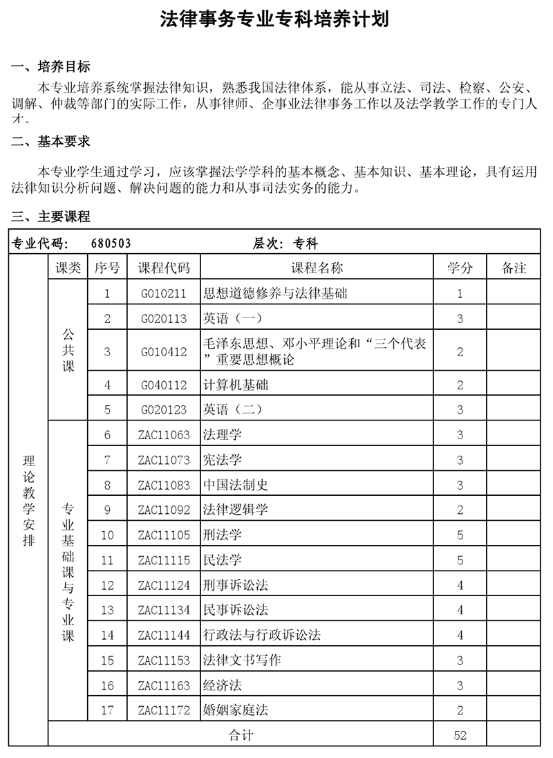 专科培养计划-专业代码:680503 法律事务专业
