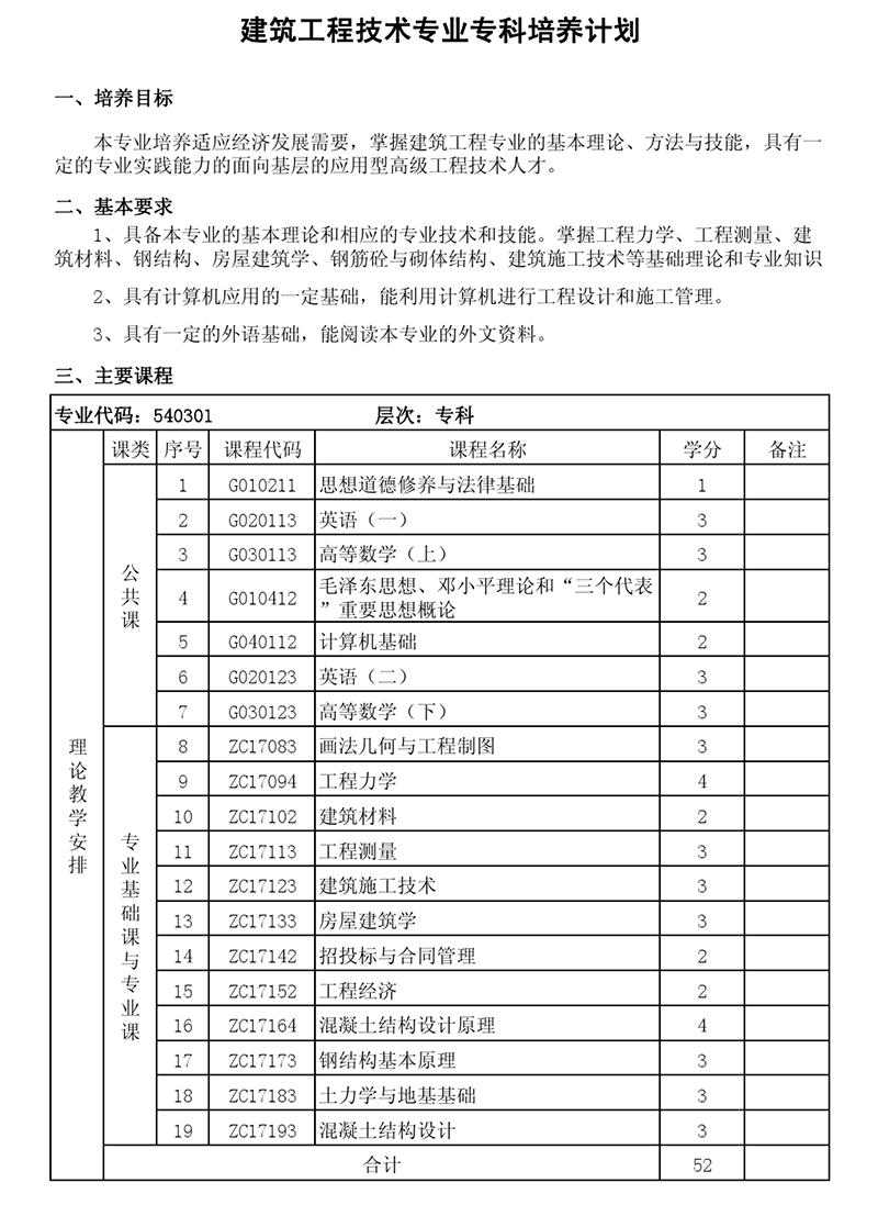 专科培养计划-专业代码:540301 建筑工程技术专业