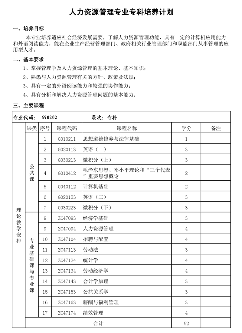专科培养计划-专业代码690202 人力资源管理专业