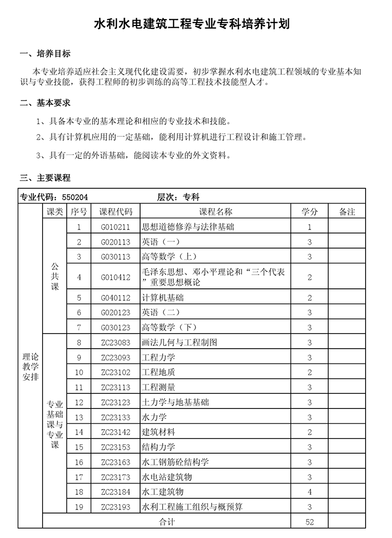 专科培养计划-专业代码:550204 水利水电建筑工程专业