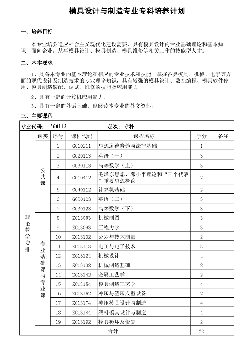 专科培养计划-专业代码:560113 模具设计与制造专业