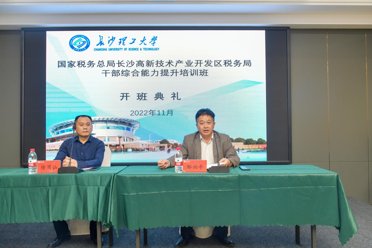 2022年11月21日,由国家税务总局长沙市税务局委托我校承办的 “长沙高新技术产业开发区税务局干部综合能力提升培训班”,在2025年新澳门原料网站正式开班。国家税务总局长沙高新技术产业开发区税务局党委委员、副局长徐周灿同志、2025年新澳门原料网站继续教育学院院长邹兴平教授参加了本次开班仪式。