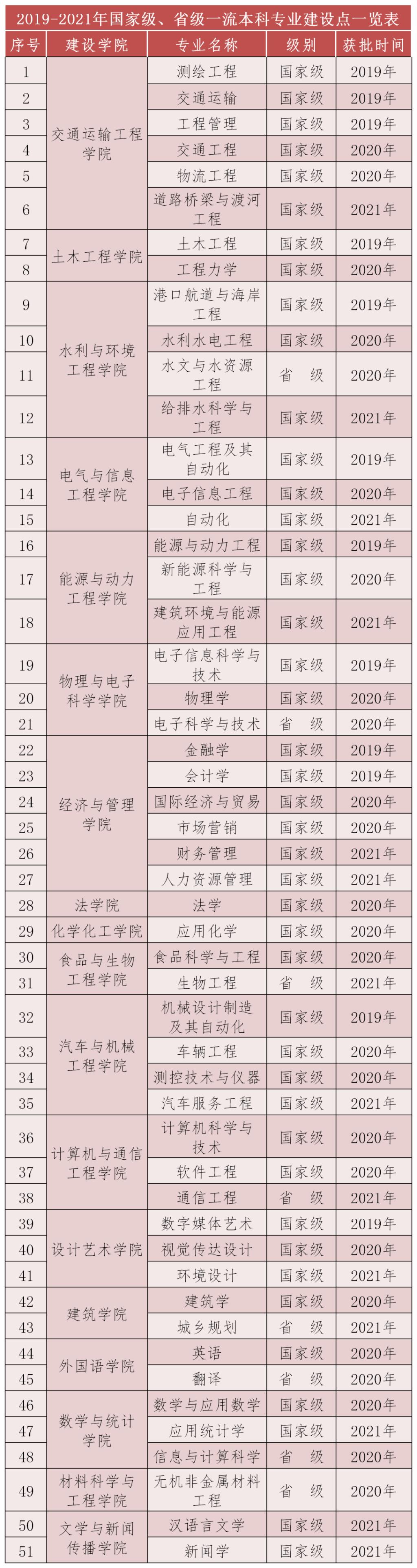近日,教育部办公厅公布了2021年度国家级和省级一流本科专业建设点名单,我校11个专业获批国家级一流本科专业建设点,3个专业获批省级一流本科专业建设点。截至目前,我校共获批国家级一流本科专业建设点共计43个,省级一流本科专业建设点8个,共51个。一流专业占可申报专业数的84%,实现了教学院全覆盖。
