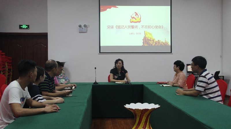 基金会党支部书记张美红结合自身经历,结合党章学习,围绕“铭记入党誓词,不忘初心使命”主题,从“学历史、悟内涵、重实践”三个方面,带领大家学习习近平新时代中国特色社会主义思想特别是教育思想,结合校友中心的实际工作指出,校友中心是学校联系校友的核心部门和展示学校形象的窗口,每一名党员同志必须以更高标准严格要求自己,把面对鲜红党旗宣誓的誓词牢牢铭刻在心中,强化自身党性修养,做好学校的形象代言人和校友的贴心人。