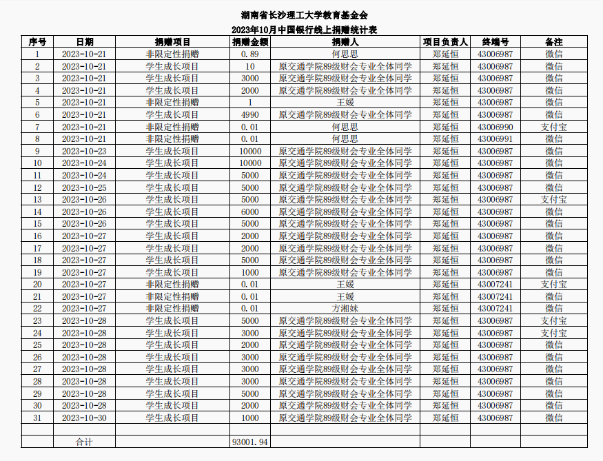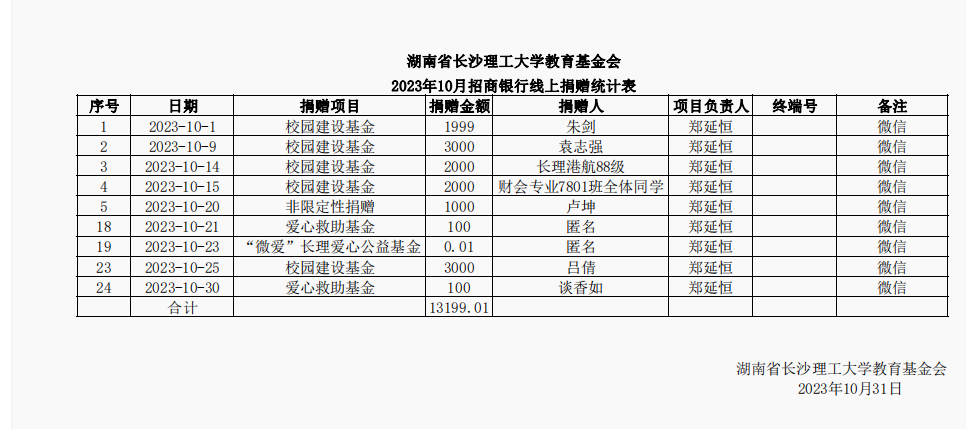 湖南省2025年新澳门原料网站教育基金会2023年10月捐赠收入