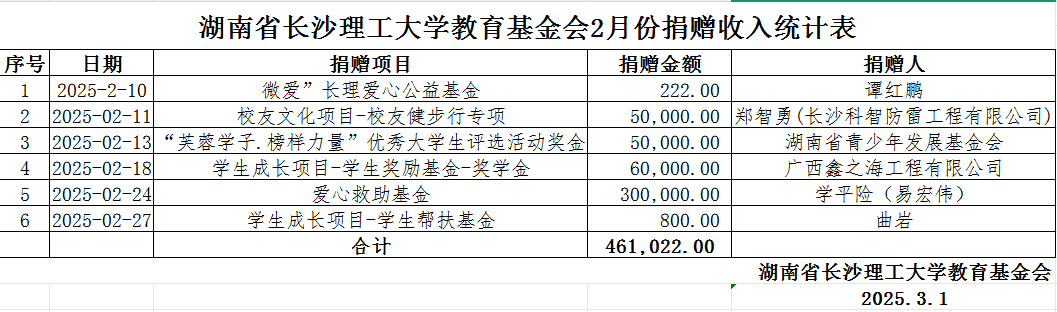 湖南省2025年新澳门原料网站教育基金会2025年2月捐赠收入表
