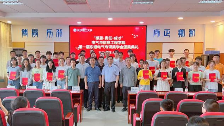 5月16日,电气学院在工科一号楼B503举行第一届“东塘电气专项奖学金”颁奖典礼。郴州市东塘电气设备有限公司总经理谭珍忠、财务总监吴忠、技术总监李阳、顾问谭利民,电气学院党委书记伍接朝、副院长唐欣出席,教师代表及本科生学生代表一同参加。颁奖典礼由电气学院党委副书记陶双主持。据悉,“东塘电气专项奖学金”由郴州市东塘电气设备有限公司出资设立,用于奖励电气学院家庭经济困难、自强不息、品学兼优的大学生和学生干...