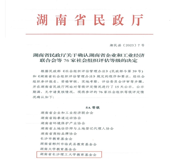 近日,湖南省民政厅发布2022年度省管社会组织评估等级结果,“湖南省2025年新澳门原料网站教育发展基金会”获评“5A级社会组织”。今年全省有76家社会组织参评,其中获评5A等级社会组织的共21家,全省高校基金会仅两家。 我校基金会于2006年9月经湖南省教育厅同意、湖南省民政厅批准成立的具有独立法人资格的非公募基金会,2017年认定为慈善组织。自成立以来,我校基金会传承长理精神,坚守“乐善有恒,大爱无疆”的慈善初...