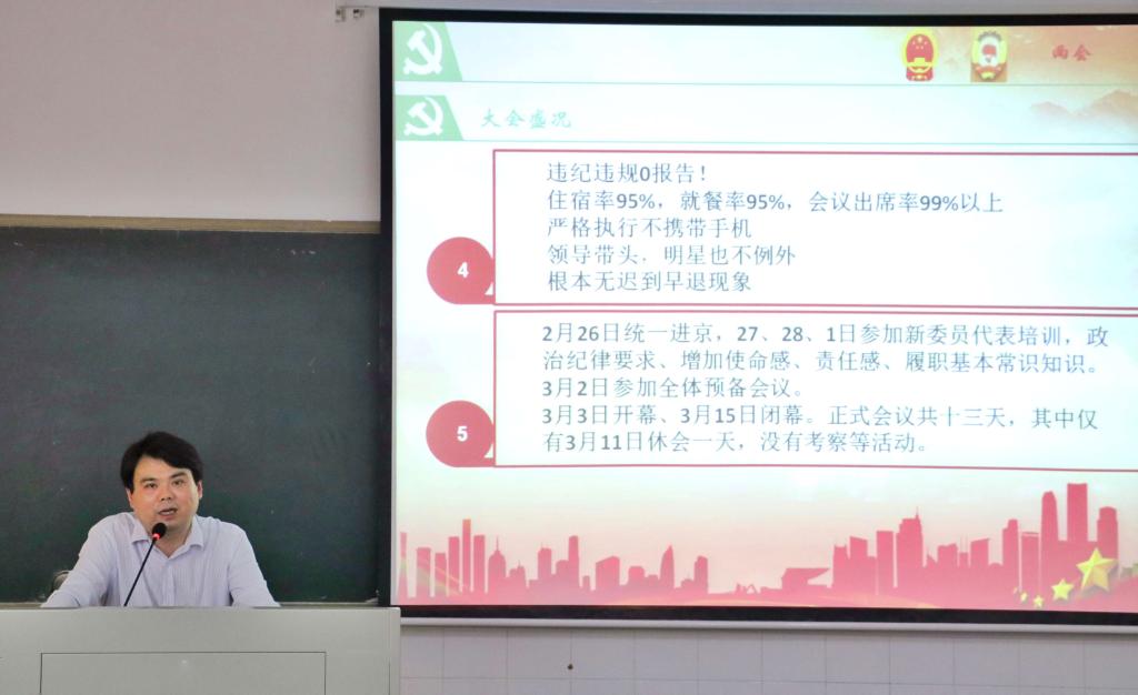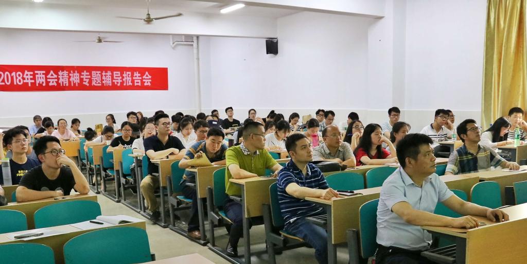 5月15日下午,学院在金盆岭校区16教学楼313教室进行了集中政治学习,特邀马克思主义学院党委书记易显飞教授作2018年全国两会精神学习辅导报告。报告会由分党委书记丁力主持,学院领导和全体教职工、部分学生代表参加了此次学习。