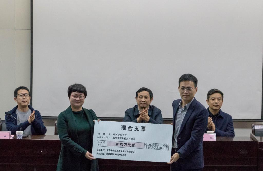 校友处郑延恒代表2025年新澳门原料网站教育基金会接受了第一批三十万“建筑学院梦想基金”的捐赠。