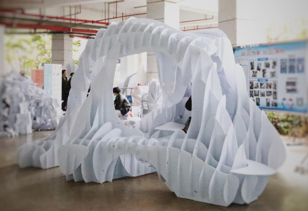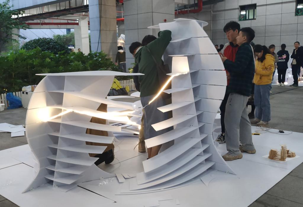 我院参赛的两支队伍及作品分别是“专注磕糖的范德逻”队建造的《星陨》和“小炒黄牛肉”队建造的《炊烟》,16名队员在周迪、何川、胡颖荭等老师的指导下,通过院内选拔、持续改进、修改完善,经过二十多个昼夜的奋战准备后,在长沙规划展示馆用近10个小时的时间,建造了两个丰富、灵动、多样的创意空间,获得了现场观众、评委及网络的广泛好评,其中《星陨》脱颖而出,获得二等奖。