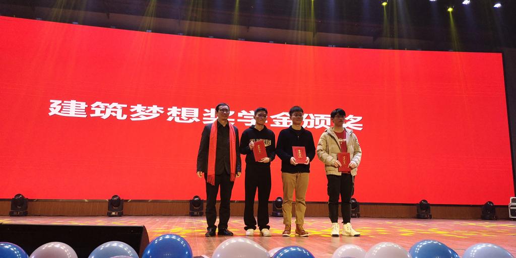晚7:00,第一届“建筑梦想”奖学金颁奖典礼颁奖典礼在五教大礼堂进行,本届奖学金共奖励了21名品学兼优、科创能力突出的本科生。杨伟军、丁力、李博、刘礼平、李威威、康伟军相继给一、二、三等奖学金获奖者颁发获奖证书和奖金,校友代表李博进行了发言。