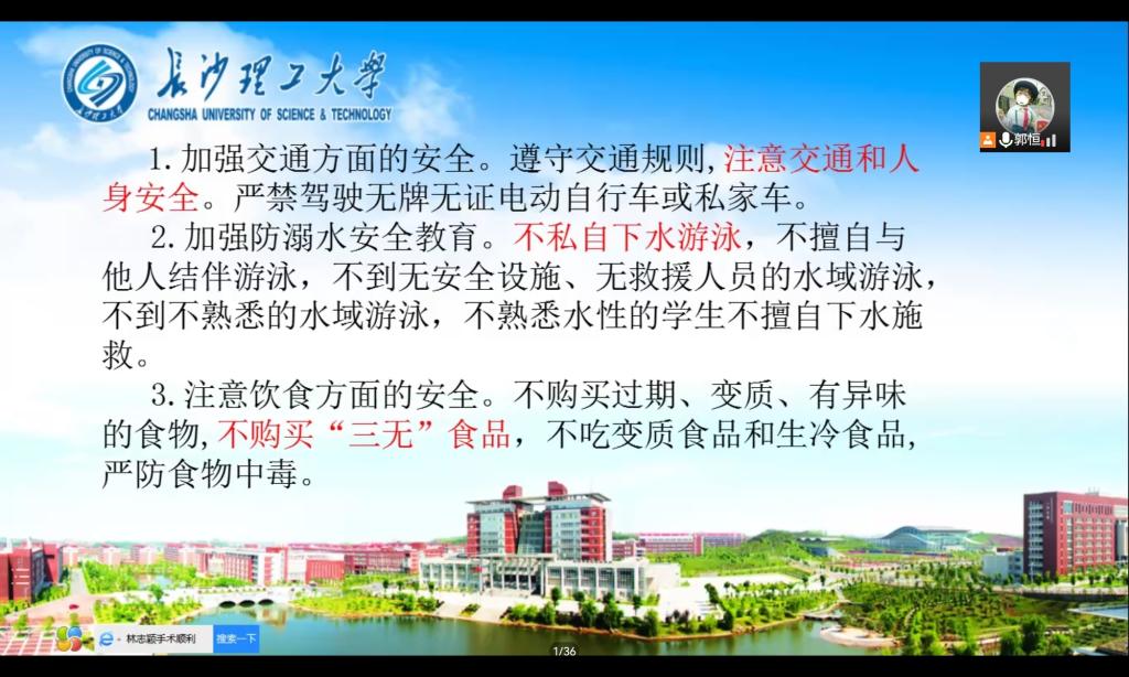 会上,李家春书记首先列举通报了近期国内发生的多项学生安全事故案例,嘱咐同学们假期在家一定要多学习安全知识,增强安全意识,提高防范和应急处突能力。随后,各年级辅导员分别从交通安全、防溺水安全、饮食安全、防电诈安全、疫情防控安全、消防安全以及防热射病安全七个方面,普及安全知识、讲解安全技能、严明安全纪律、消除安全隐患,引导增强学生自我保护的意识和能力。