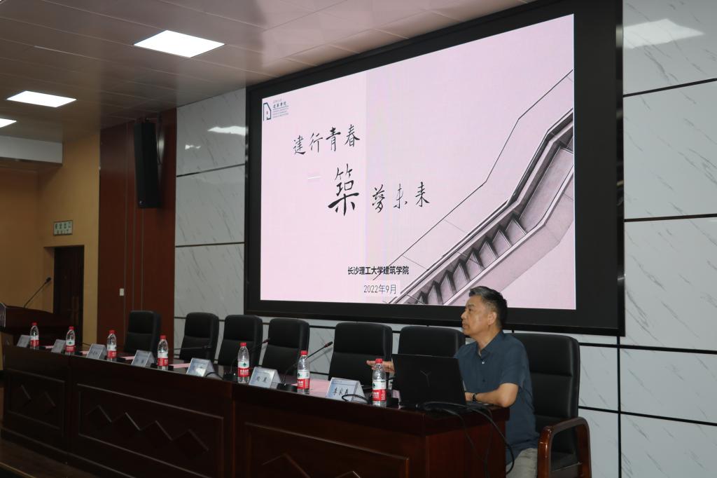 随后,全国勘察设计大师、建筑学院院长杨瑛为全体新生做了题为“建行青春,筑梦未来”的院长第一课。杨瑛大师首先从是什么、学什么、干什么、有什么四个方面详细介绍了建筑学、城乡规划和风景园林三个专业的课程设置与人才培养体系,毕业生的毕业去向,学院的发展成就、师资力量和学习环境,以及优秀校友情况。随后,他以苏仙岭景观瞭望台设计为例,与大家分享了如何从中华优秀传统文化中挖掘创作元素,融入现代设计艺术创作,把人文学科与人文科学完美结合,精彩的分享引发同学阵阵掌声。最后,他叮嘱同学们多读书、勤思考、多锻炼,立大志、明大德、成大才、担大任,在专业道路上实现人生理想,成为堪当民族复兴重任的新时代长理人。