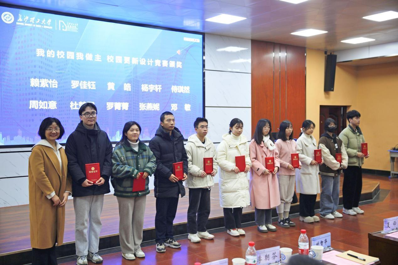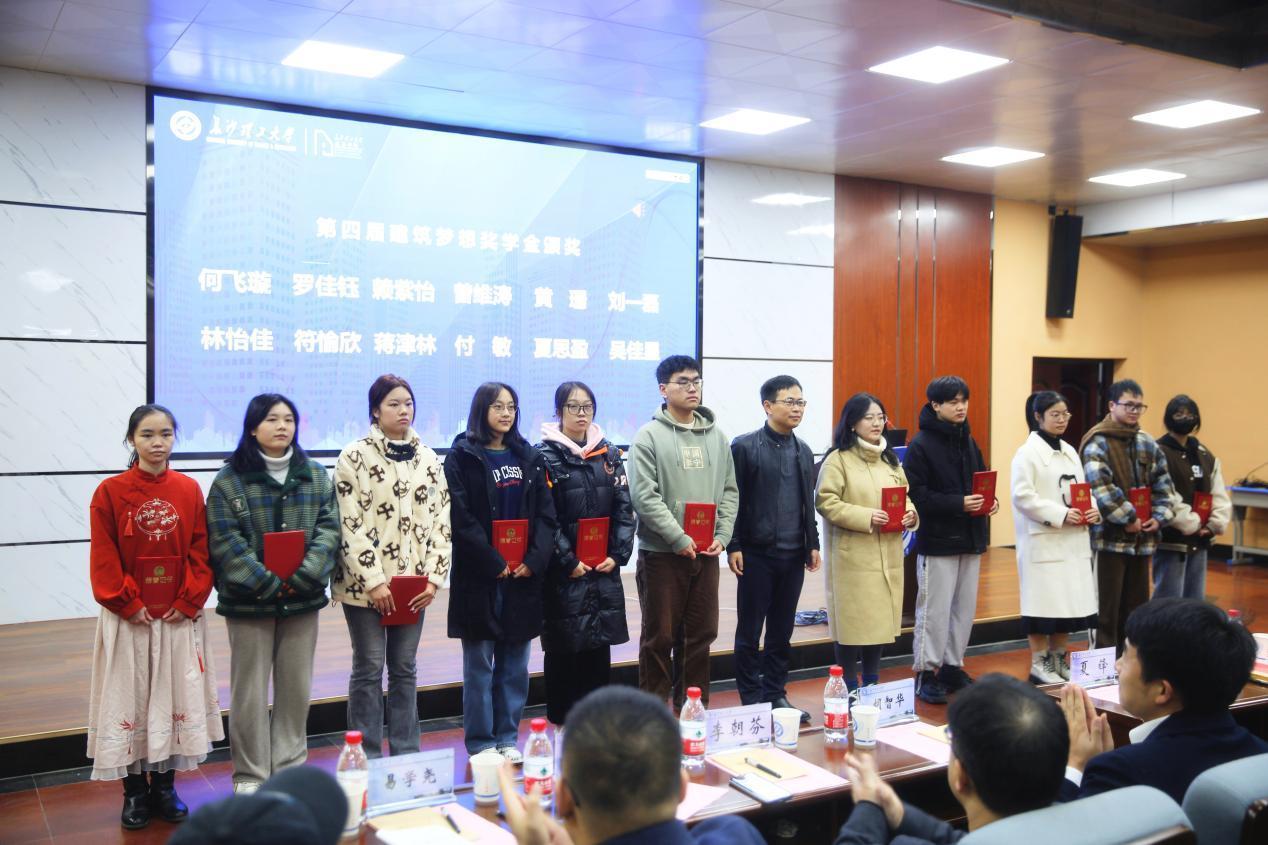 在颁奖仪式环节,上海宝业集团总经理、建筑学院校友分会会长夏峰,湖南中地智合规划建筑设计有限公司执行董事、总经理李朝芬,长沙卓之越教育咨询有限公司胡智华,建筑学院常务副院长许建和,建筑学院副院长周晨,分别为第四届建筑梦想奖学金、职业生涯规划大赛、“我的校园我做主”校园更新设计竞赛、乡村振兴规划设计大赛获奖代表颁奖。