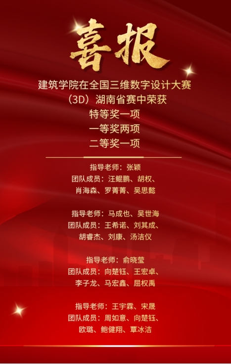近日,全国三维数字设计大赛(3D)湖南省赛落下帷幕,建筑学院凭借出色的表现和创新设计,在此次大赛中荣获多个奖项。在本次比赛中,建筑学院共斩获一个特等奖、两个一等奖和一个二等奖。