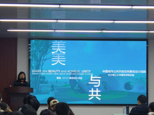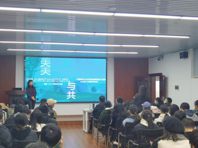讲座中,黄剑凭借其丰富的设计经验和对城市公共空间的独到见解,为在场的同学们带来一场视觉与思想的盛宴。在本次讲座中,她结合自己丰富的实践经历,对中国城市公共开放空间景观设计进行回顾和分析。她带领与会人员回顾并梳理中国城市公共开放空间景观设计的发展轨迹,揭示不同时代背景下的设计特点和社会需求。她从多个方面,如空间规划、功能布局、设计理念等,对一些典型的国内外公共开放空间景观设计案例进行深入剖析,为在座师生们提供宝贵的参考和启示。她站在当前社会发展的角度,探讨中国城市公共开放空间景观设计面临的挑战与未来发展趋势,以期为我国城市公共空间的优化提供有益的建议和思考方向。
