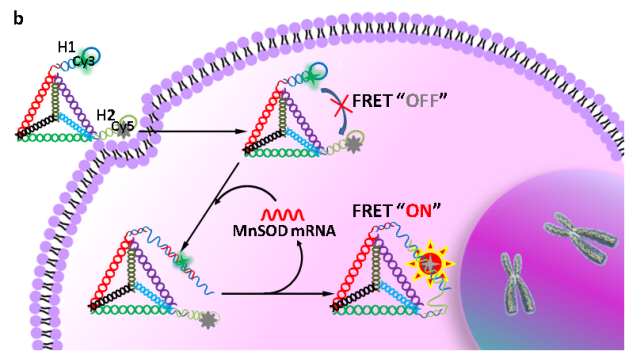 细胞是组成生命体的基本单元,细胞内生化物质(核酸、蛋白质、活性小分子)的表达失调往往与疾病密切相关,包括癌症、神经性疾病、糖尿病等重大疾病。准确获取细胞成分信息是研究细胞生命状态、活动功能和病理变化的关键,而发展有效的分析检测技术是实现生化信息准确获取的基础。一些重要细胞成分通常含量低(nM水平或更低),难以通过常规的方法进行检测,信号放大技术显得尤为重要,例如针对核酸信号放大的PCR等酶促放大技术。PCR等酶促放大技术为低丰度标记物检测提供了重要手段,但往往依赖于热循环过程、蛋白酶的使用、精密控温装置等条件,将放大反应局限于缓冲液、细胞裂解液或死细胞。生命物质处于动态变化中,细胞生命状态的变化会导致细胞成分含量、构型、活性的变化。所以,离体的分析技术难以反映最真实的生命状态,发展细胞内信号放大技术尤为重要。