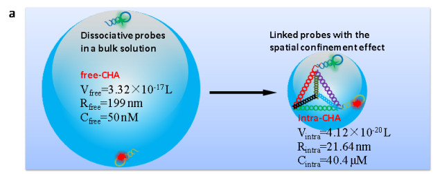 图1:(b) 根据碰撞效率理论,intra-CHA和free-CHA探针理化参数的推算;(b) intra-CHA探针对细胞内mRNA的原位信号放大成像过程示意图.