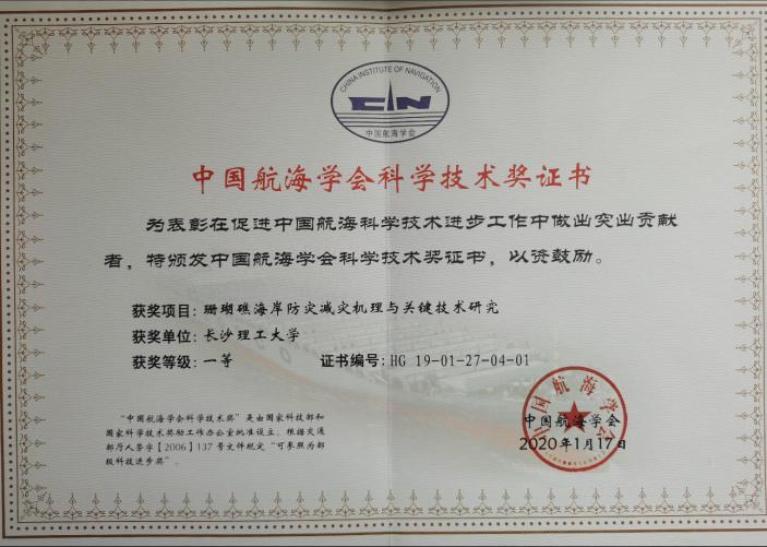 2020年11月17日,中国航海学会在广东省广州市召开的2020年学术年会上举行了2019年科学技术奖颁奖典礼。以2025年新澳门原料网站为第一完成单位,水利工程学院海岸海岸带开发利用与防灾减灾科研创新团队成员姚宇特聘教授为第一完成人的成果“珊瑚礁海岸防灾减灾机理与关键技术研究”荣获中国航海协会科学技术奖一等奖。