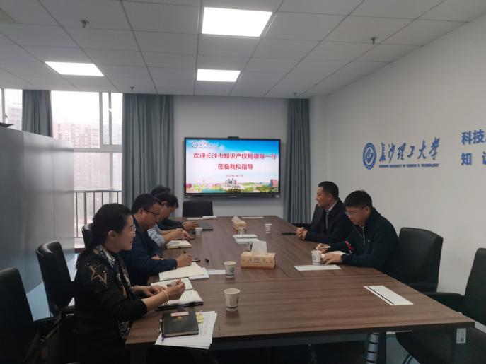 王进对康勇一行表示热烈欢迎,感谢长沙市知识产权局长期以来对我校的建设发展提供的支持与帮助,并表示学校高度重视知识产权工作,在知识产权管理及成果转化方面制定了一系列的制度,采取了相关举措,把知识产权管理工作落到实处。王媛媛详细汇报了学校计划在知识产权管理制度方面开展的整改措施。刘亚辉简单介绍了学校成果转化中心,并表示学校将在市知识产权局的指导下,大力推动学校科研成果转化,为长沙市创新型城市建设贡献力量。