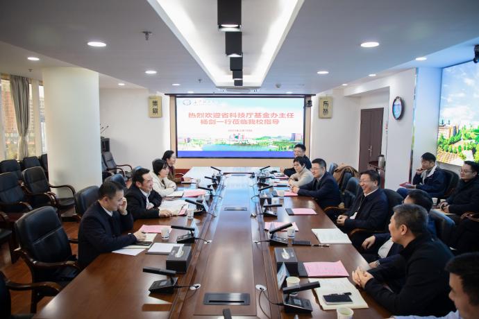 2月18日下午,湖南省科技厅基金办主任杨剑一行来校调研指导工作。校党委书记付宏渊,校党委委员、副校长张军辉出席调研座谈会,校科技处处长胡林、校科技处相关工作人员、已获评国家杰青、国家优青科研人员以及拟申报2025年度青年A(原国家杰青)、青年B(原国家优青)科研人员参加座谈会,会议由省科技厅基金办主任、一级调研员杨剑主持。