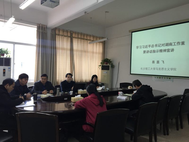 易显飞首先传达了学校《关于深入学习贯彻习近平总书记对湖南工作重要讲话指示精神的通知》精神,对相关工作做了专门部署。易书记从坚持“一带一部”战略定位、把经济结构战略性调整作为主攻方向、湖南发展的根本出路在于创新、扶贫开发作为加快民族地区发展的重中之重、着力推进农业现代化、城镇化路子必须走正、守护好一江碧水、切实补齐民生短板、把作风建设摆在更加突出的位置及传承红色基因与不忘使命等十个方面对习近平总书记对湖南工作重要讲话指示精神进行了全面深入讲解。然后从辩证思维、战略指导、人民情怀、底线意识等方面对总书记关于湖南工作重要讲话指示精神的特质进行了概括与总结。