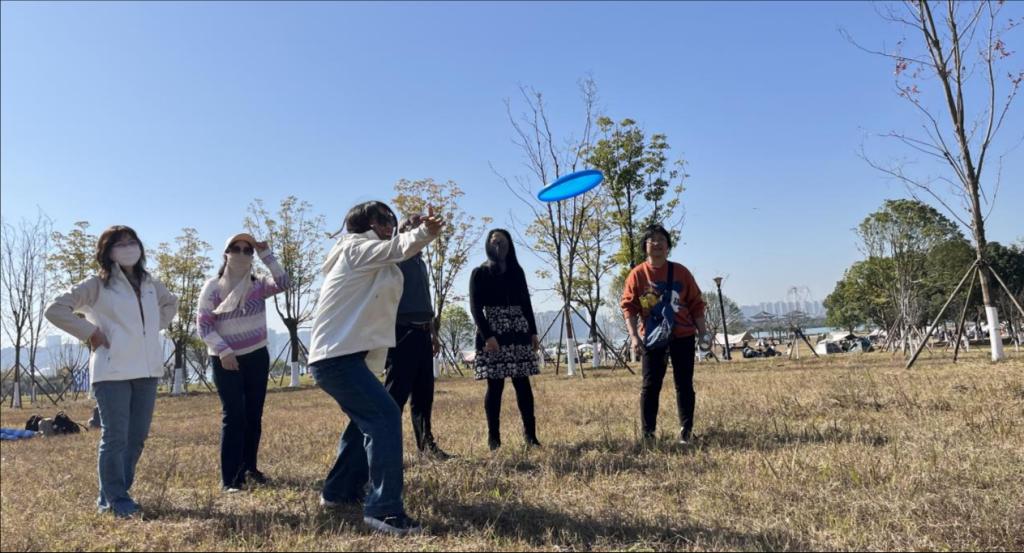 飞盘展示竞技活动在松雅湖边宽阔的草地上进行。首先,学院资深飞盘玩家赖谋琛老师开展了飞盘比赛现场教学,从飞盘握姿、身体姿势配合、手臂手腕发力、飞行方向掌控技巧等方面给大家进行了耐心详细的讲解和示范。老师和子弟们围成一个数千平方米的大圈,相向而立,分组对抗。由于大多数老师平时不经常接触飞盘,部分队员在动作姿态、发力技巧、方向把控等方面略显生疏笨拙,展示过程错漏百出,频频收获善意嬉笑,但也涌现出不少飞盘运动天赋和悟性超强的队员,奋力一掷飞出百米开外的惊喜亮相也不在少数。在展示竞技过程中,赖老师还不时地指导示范,传授运动技巧,规范投掷动作,发掘培养飞盘运动人才,大家对学院在以后的校运会飞盘比赛中取得更好成绩充满信心。