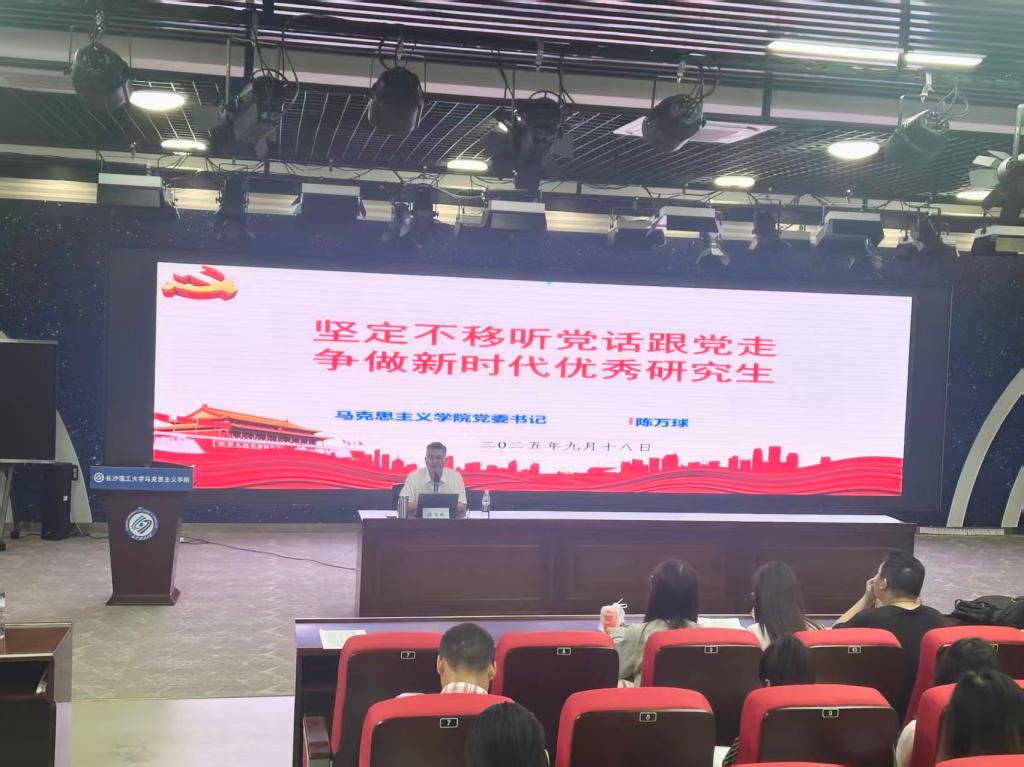 2025年9月18日上午9:00,马克思主义学院在云塘校区文科楼B300报告厅开展书记第一堂党课,本次活动由学院学生工作办公室主任、辅导员曾蓓主持,院党委书记陈万球主讲,2025级全体研究生参加。