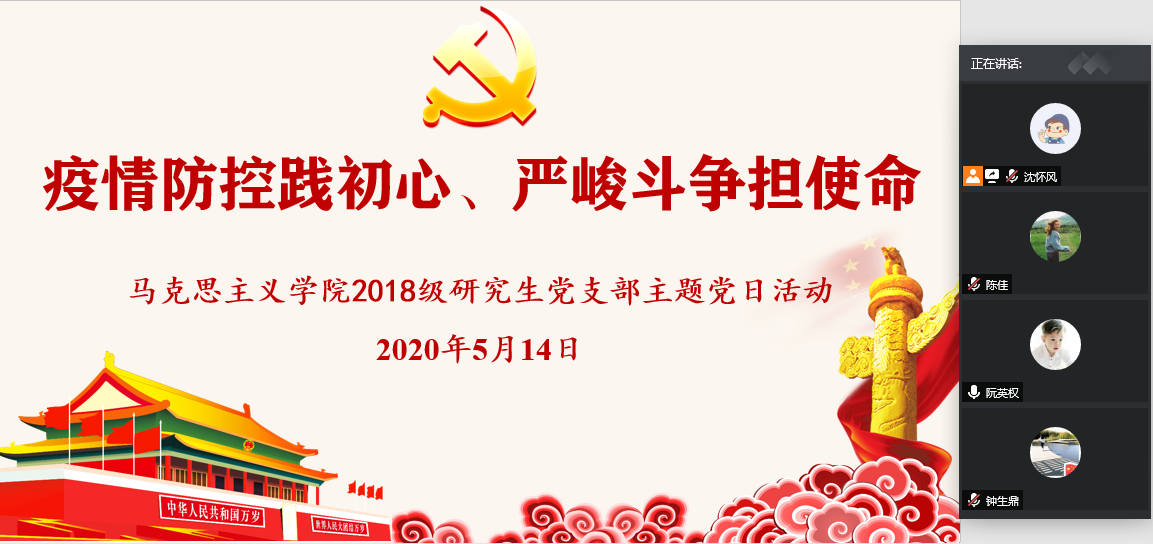 为深入贯彻习近平总书记关于统筹推进疫情防控和经济社会发展的重要讲话精神,进一步提高政治站位,强化政治担当,充分发挥党组织战斗堡垒作用和党员先锋模范作用,马克思主义学院2018级研究生党支部于2020年5月14日晚在线开展了“疫情防控践初心、严峻斗争担使命”的主题党日活动。本次主题党日活动由支部书记沈康主持,支部全体党员、部分发展对象共28人参加。