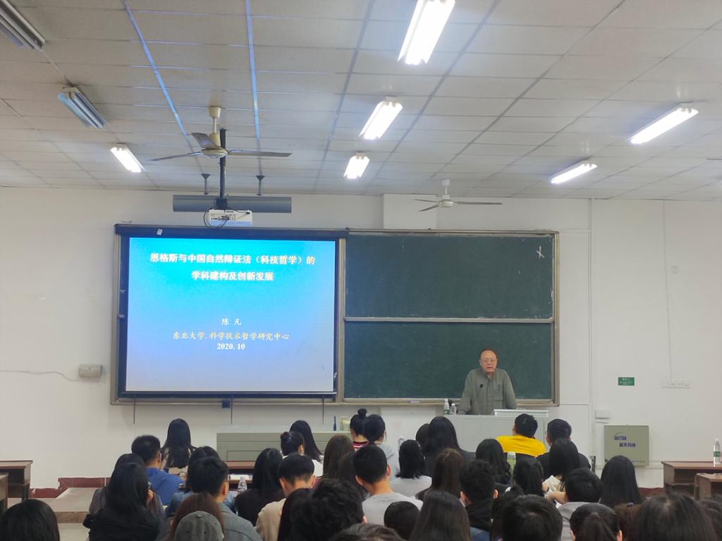 10月31日上午9点,东北大学博士生导师陈凡教授应马克思主义学院邀请,在我校金盆岭校区4教109作了题为《恩格斯与中国自然辨证法(科技哲学)的学科建构及创新发展》的学术讲座,讲座由我院院长陈万球主持,李雨燕副院长、院学科办文贵全主任、廖苗副教授、刘佳男博士等我院教师,学院2020级全体研究生听取了讲座。