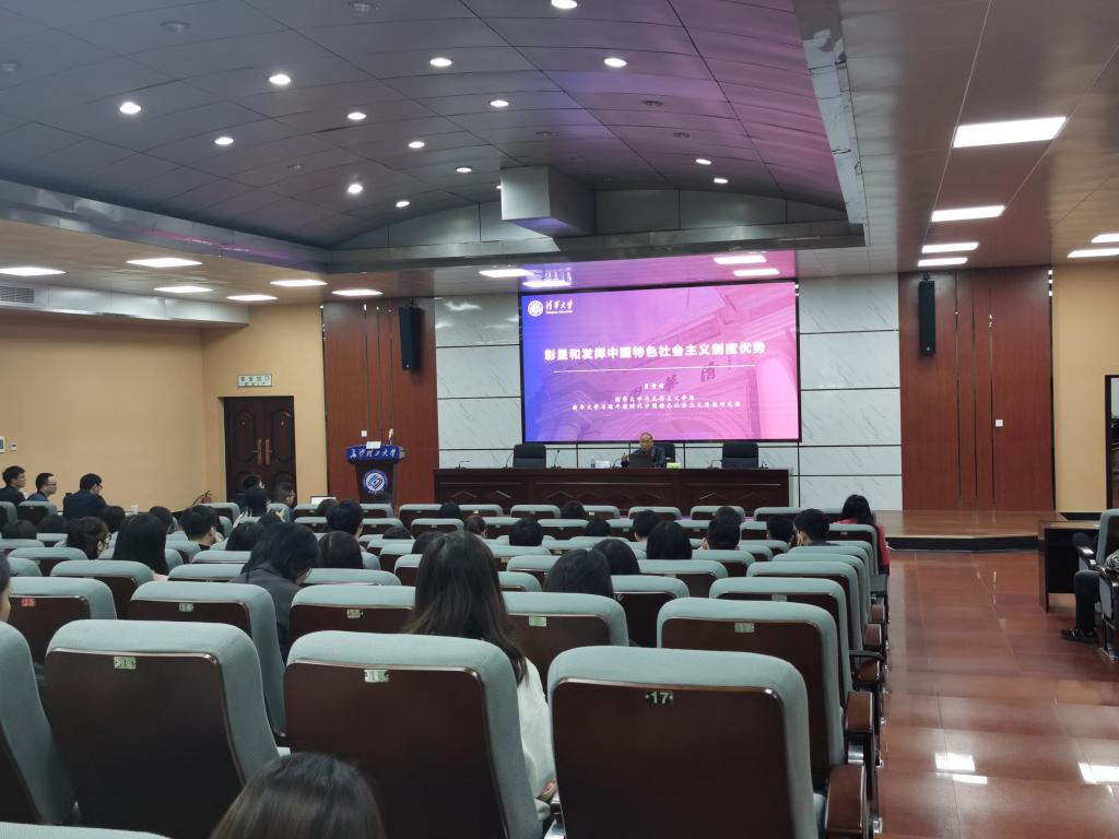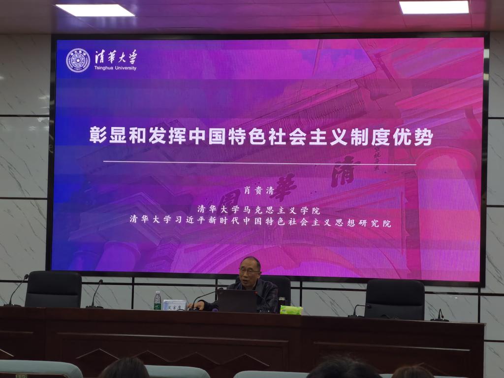 10月19日上午9时,清华大学习近平新时代中国特色社会主义思想研究院副院长、博士生导师肖贵清教授应邀在我校金盆岭校区4教1楼报告厅主讲了题名为《彰显和发挥中国特色社会主义制度优势》的专题讲座。马克思主义学院张明海副院长,谢文成副教授、陈方芳博士、王威峰博士等专业老师,以及部分辅导员老师、校机关部分人员,学院在校二三年级研究生及2020级马克思主义理论专业全体研究生参加了本次讲座,讲座由张明海教授主持。