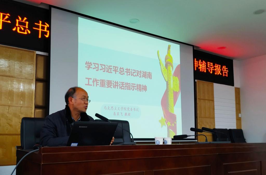 会议伊始,易显飞从十个方面详细介绍了湖南省发展的优势、不足和现状,深入分析习近平总书记对湖南工作重要讲话指示精神的内涵。他指出:“推动湖南经济高质量发展需要牢记习近平总书记的嘱托,坚持理论与实践相结合,切实找准教育教学、科研创新与全省发展大局的结合点,引导广大师生积极投入经济建设主战场,主动参与我省产业发展的火热实践。”
