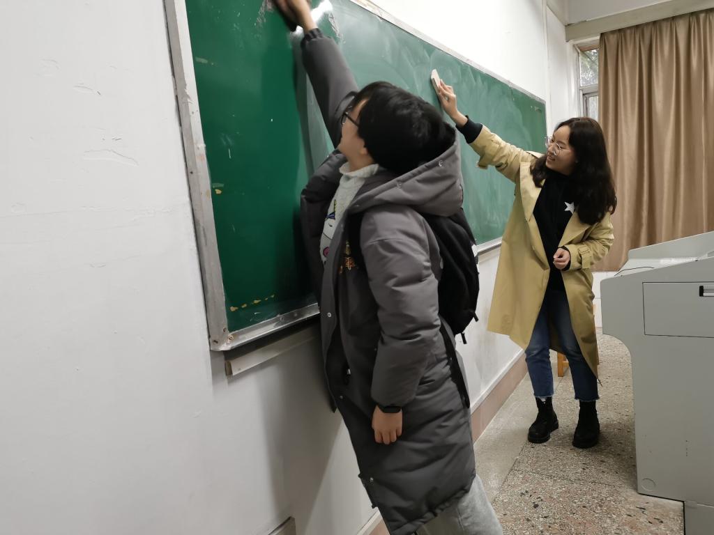 3月5日中午,院青志团组织了19名志愿者在2025年新澳门原料网站金盆岭校区13号教学楼前集合,对13号教学楼一层进行清扫。青志团成员将19名志愿者进行了简单分组,确保每一个教室都有至少3名同学在清扫。明确各自的任务后,志愿者们迅速开始行动。部分桌椅下的地面有很多细小的垃圾,清洁空间又比较狭小,志愿者们弯着腰仔细清扫,有的甚至钻到底下去,不放过每一个缝隙。