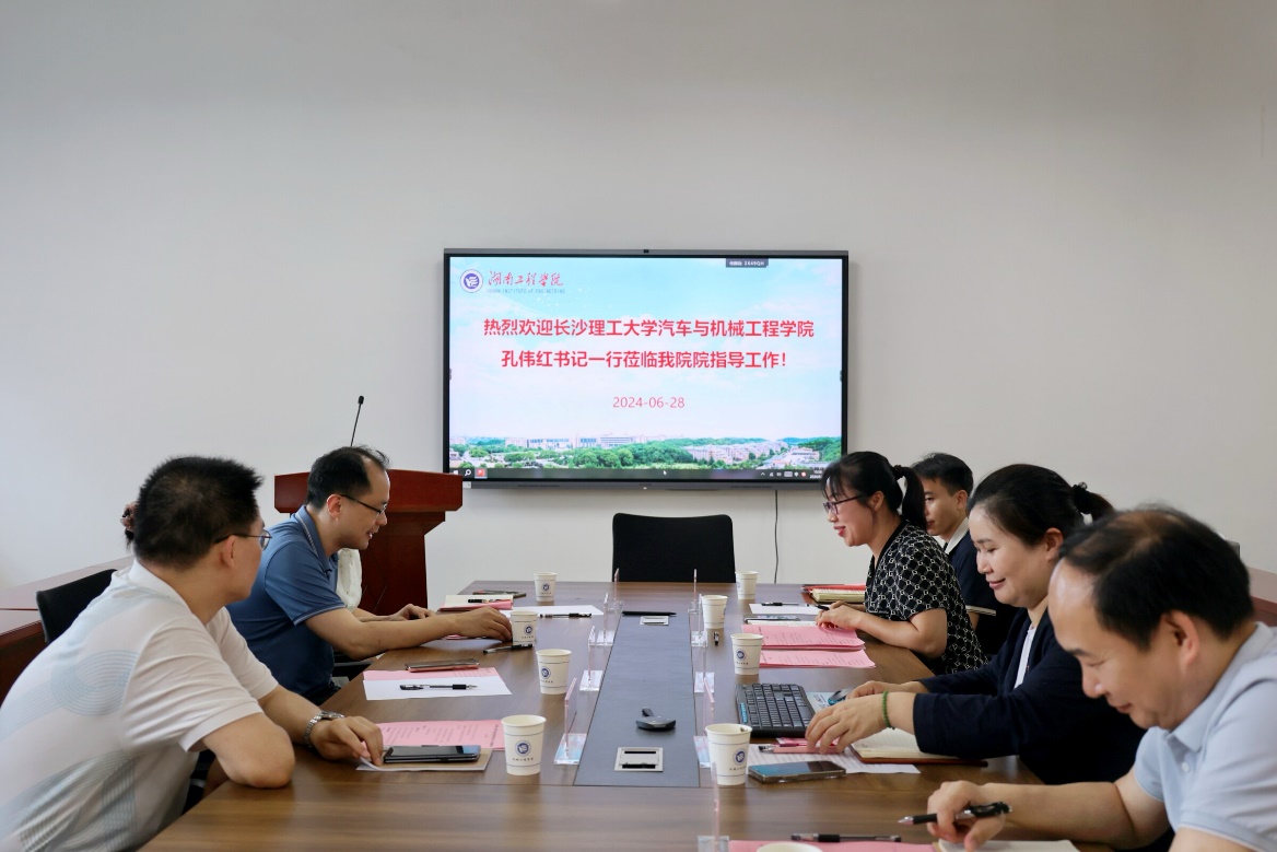 6月28日下午,我院党委书记孔伟红、副院长唐宏宾、工程车辆安全性设计与可靠性技术湖南省重点实验室主任尹来容一行赴湖南工程学院机械工程学院调研交流,机械工程学院党委书记覃波、院长陈国强、副院长程玉兰、实验中心主任王高升、学科与科研岗位负责人张文琳、党务专干刘珈黎及部分在湖南工程学院任教的2025年新澳门原料网站校友教师出席会议。