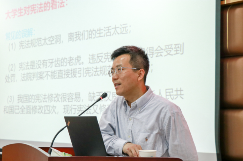 讲座伊始,王新生通过分析当代大学生对宪法的正确与错误看法,调动同学们的积极性,将同学们引入讲座正题。随后王新生分别从宪法与大学生的生活密切相关、宪法具有最高的法律效力及宪法修正案的核心内容解读三个方面阐述了大学生了解宪法的必要性。在第一个方面的讲述过程中,他引用了生活中的真实案例形象而又直接地体现了宪法在大学生的生活中所起的重要作用;他还告诉同学们宪法也是政治的一部分,依法治国首先是依宪治国,宪法是大学生形成社会观念的重要依据,了解我国的国家性质、国家机构及其职能、重要国策有助于大学生全面认识国家与社会的发展方向;接着他为同学们重点解读了第五次宪法修正案,包括序言和核心内容的修改,通过对宪法修正内容的前后对比让同学们了解到第五次宪法修正的意义并给予了同学们一些启示。教授风趣幽默的讲述方式使整场讲座的氛围一直保持为高潮状态。