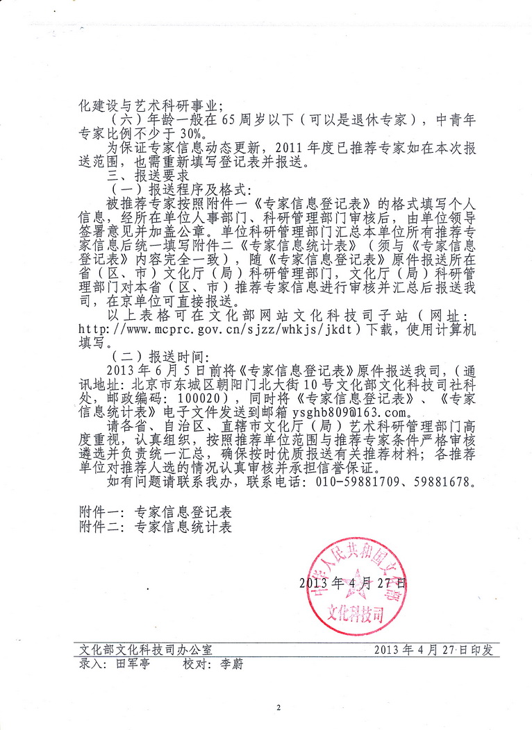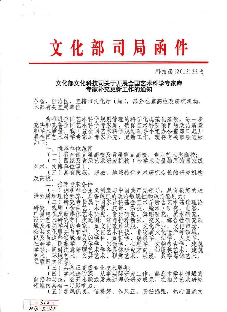 现将《文化部文化科技司关于开展全国艺术科学专家库专家补充更新工作的通知》(科技函〔2013〕23号)转发给你们。请按照有关要求认真做好本单位艺术科研相关领域专家的推荐工作,并于2013年5月24日前将《专家信息登记表》、《专家信息统计表》的纸制材料(原件各2份)报送人文社科处711室,同时将电子版文件发送至指定电子邮箱。