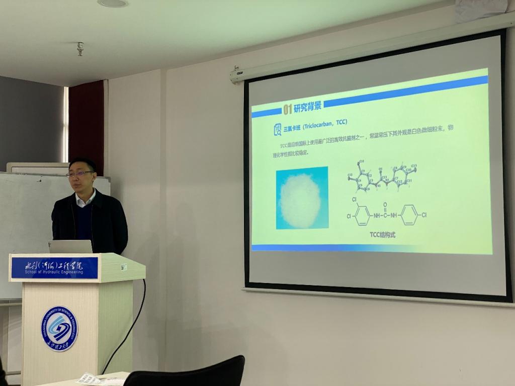 王冬波还为我校师生作了一场《三氯卡班在硝化系统中的行为及其影响》专题讲座。随后,我院2018级硕士生王泓同学和2019级硕士生涂智同学分别作了《一段式自养脱氮生物反应器的研发及性能研究》和《单级自养脱氮气升式自循环分区反应器的脱氮性能研究》的学术汇报;并由王冬波对其分别进行指导。