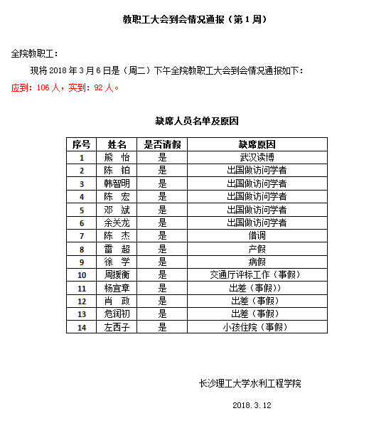 2017-2018第二学期教职工大会到会情况通报(第1周)