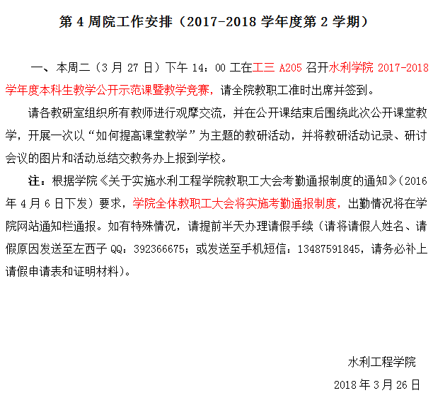 第4周院工作安排(2017-2018学年度第2学期)