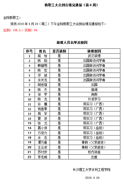 教职工大会到会情况通报(第8周)