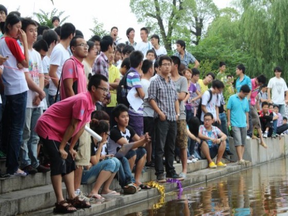 参赛选手们在听完规则介绍后,就迫不及待的把倾注了自己许多天心血和汗水的船模作品搬到评委席前进行展示。介绍的同学滔滔不绝地讲述着自己作品的创作灵感和制作过程。评委们认真听完讲述后,不住地点头予以肯定。物电学院的三位同学创意颇高,运用他们的专业知识直接用电脑发射信号控制船的航行,同时这艘船也能传回湖里的实时水温并显示在电脑屏幕上。这艘高技术含量的船自然引起了评委和同学们的高度关注。