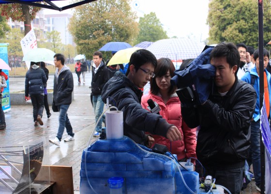 尽管当天下着淅淅沥沥的小雨,可大家参与活动的热情依然高涨,记者随即采访了大禹之子社团的会长梁晨以及理事刘志达,通过他们的介绍大致了解了社团近年来参与的各类大型环保活动以及受到的荣誉与奖励。之后,记者又来到了“科技之光”展示区,听水利学院科技部部长翁常东对储水以及排水的两项科技发明进行了详细讲解与分析。整个活动持续近三个小时,随着采访的结束,活动宣告圆满结束。