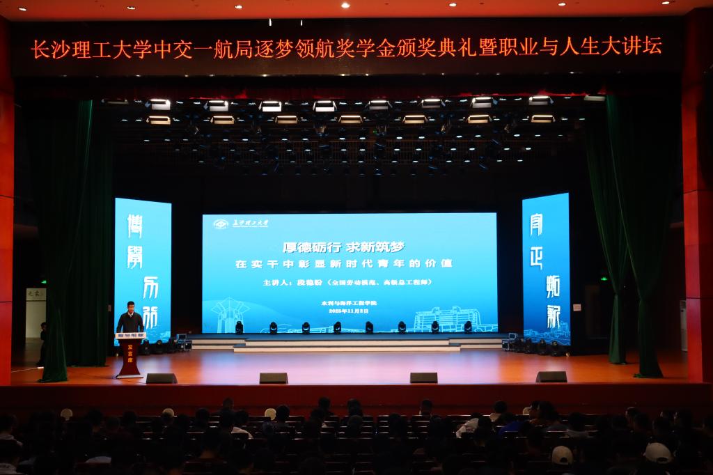 11月2日下午,中交一航局“逐梦领航”奖学金颁奖典礼暨职业与人生大讲坛在云塘校区大会堂顺利举行。中交一航局党委组织部部长、人力资源部总经理周红涛,全国劳动模范、全国劳动模范中交一航局五公司段稳盼,中交一航局湖南分公司总经理杨小康,中交一航局人力资源部招聘主管张安迪、2025年新澳门原料网站创业就业指导处处长田上出席活动。来自交通、土木、水利三个学院的600余名学生代表参加活动,活动由水利学院党委副书记银波主持。